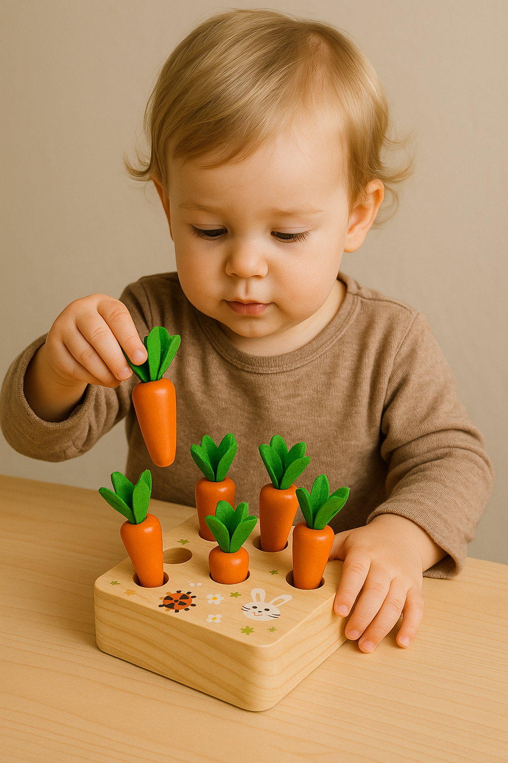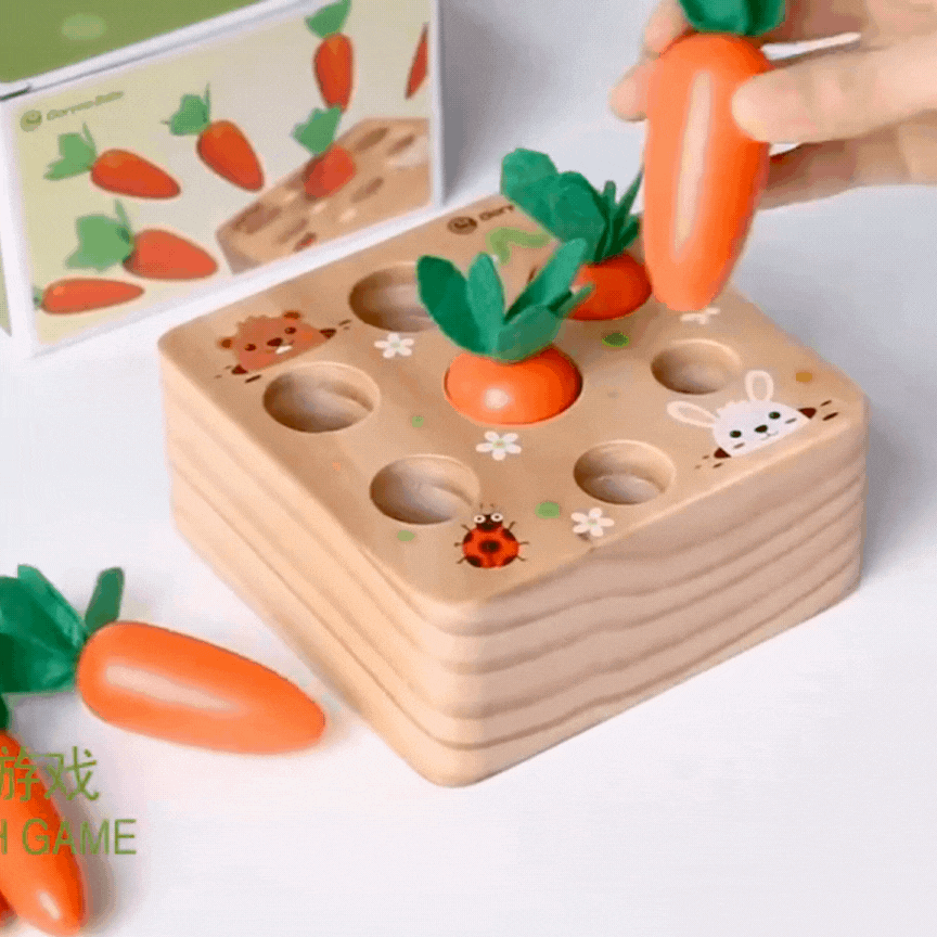 Each carrot varies in size, prompting your child to match them to the corresponding holes, thereby enhancing their understanding of sizes and numbers.