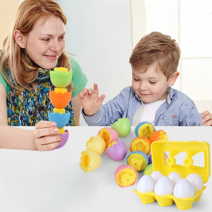 Each egg splits into two halves, with the inside featuring a unique shape (e.g., circle, star, triangle) and color. The halves are mixed up to create a fun challenge with the goal to find the matching half that fits. The perfect gift for birthdays, baby showers, and special occasions.