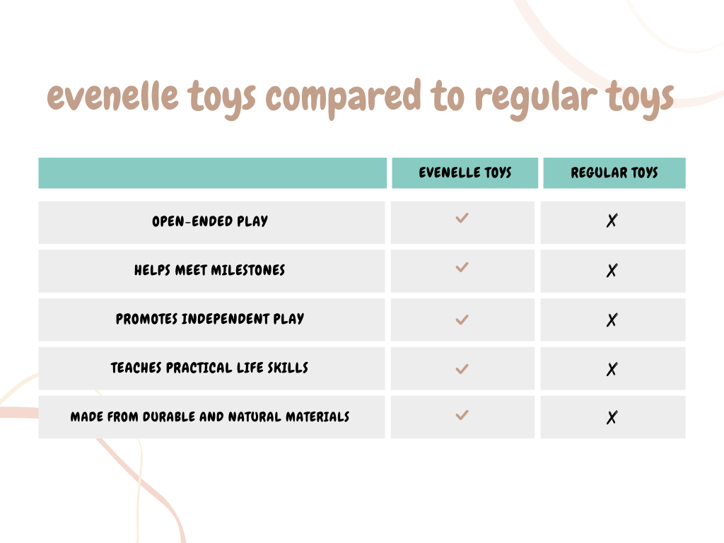 evenelle products are made from high-quality natural materials such as wood. Typically, wood is much more expensive to source in comparison to plastic. We believe in producing the highest quality Montessori inspired toys, so you and your child can safely enjoy for many years to come.