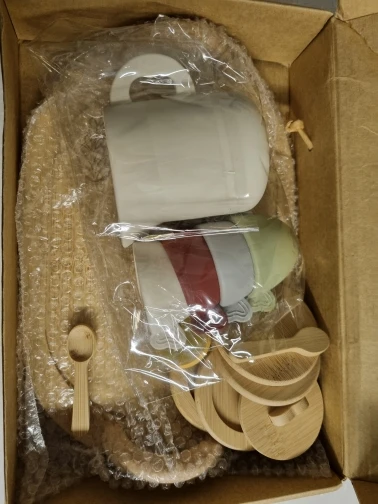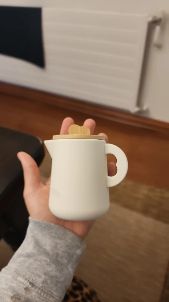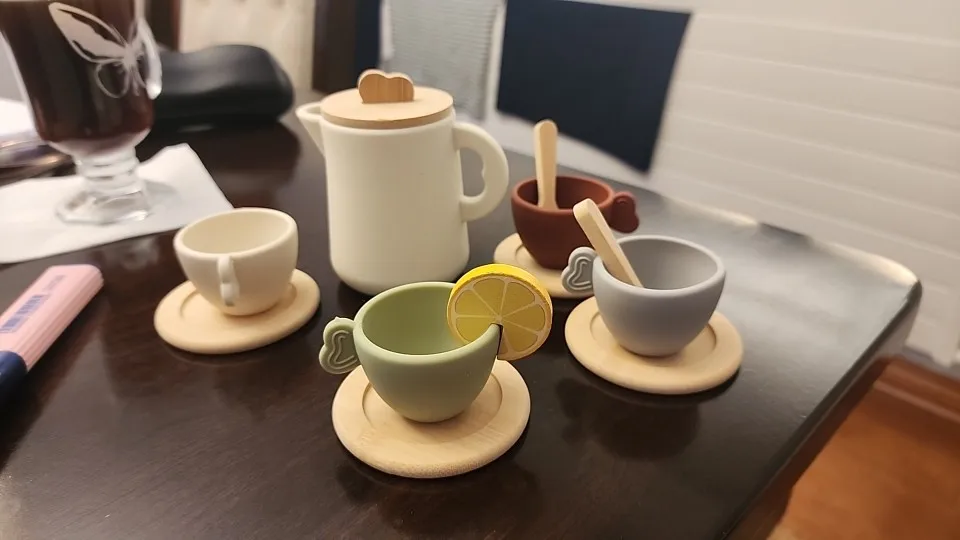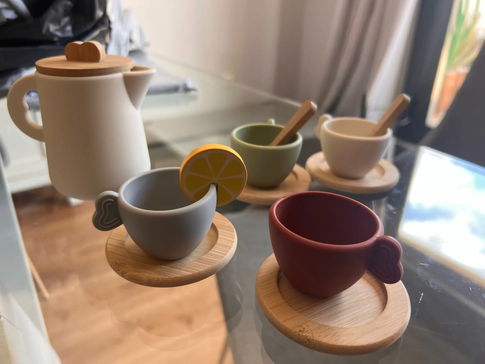 Very cute. Only the plates and spoons are made of wood, the cups and the jug are made of silicone. They are smaller than I thought, but they are still very beautiful and of good quality